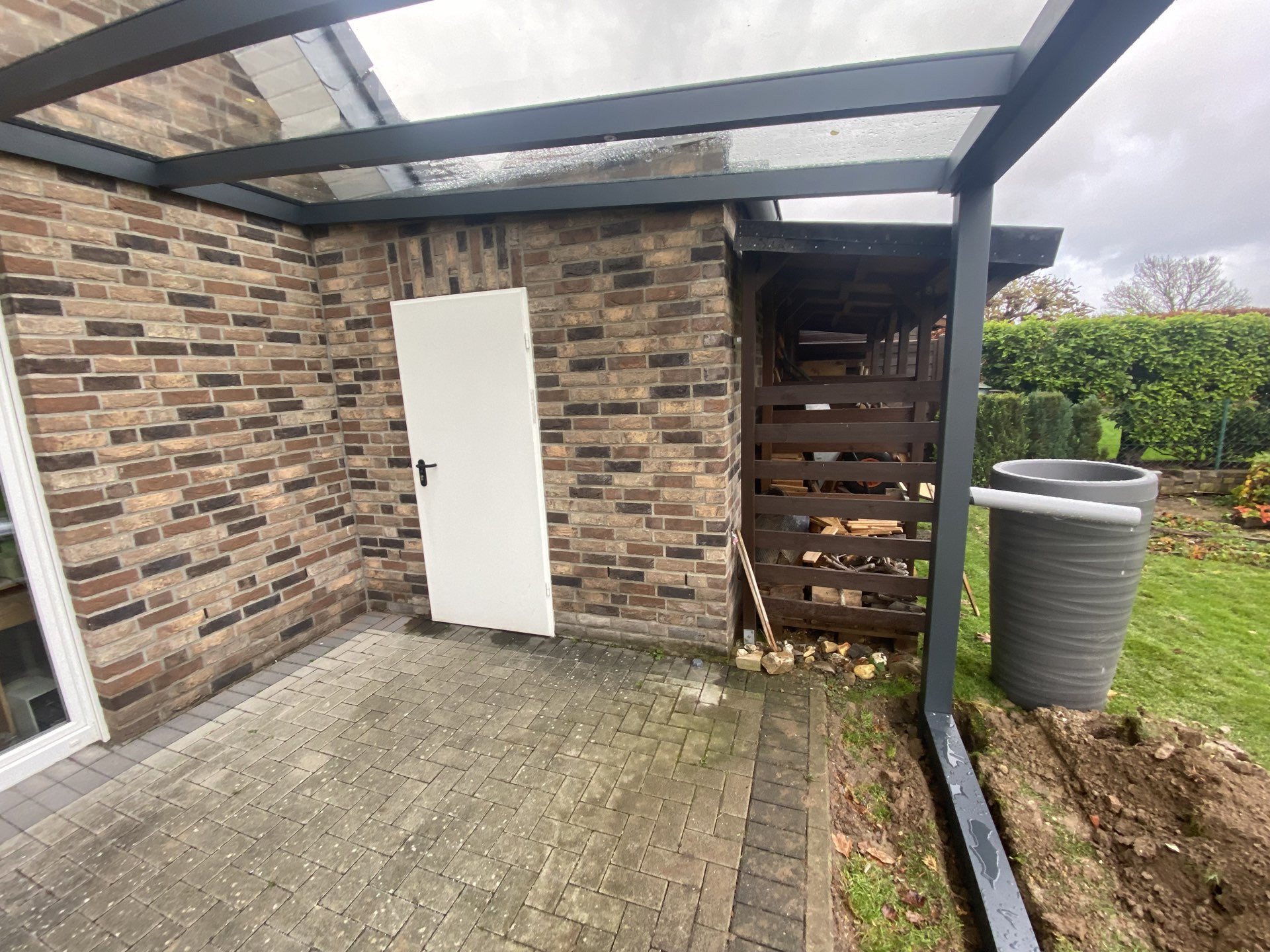 Die Besitzer eines EInfamilienhauses wollten ihre Terrasse „wettersicher“ machen. Aufenthalt bei Regen und Wind mit Blick in den Garten. In zwei Bauabschnitten wurde nach einem Aufmaßtermin aus der ungeschützten Terrasse ein Kaltwintergarten mit Glasschiebetüren.