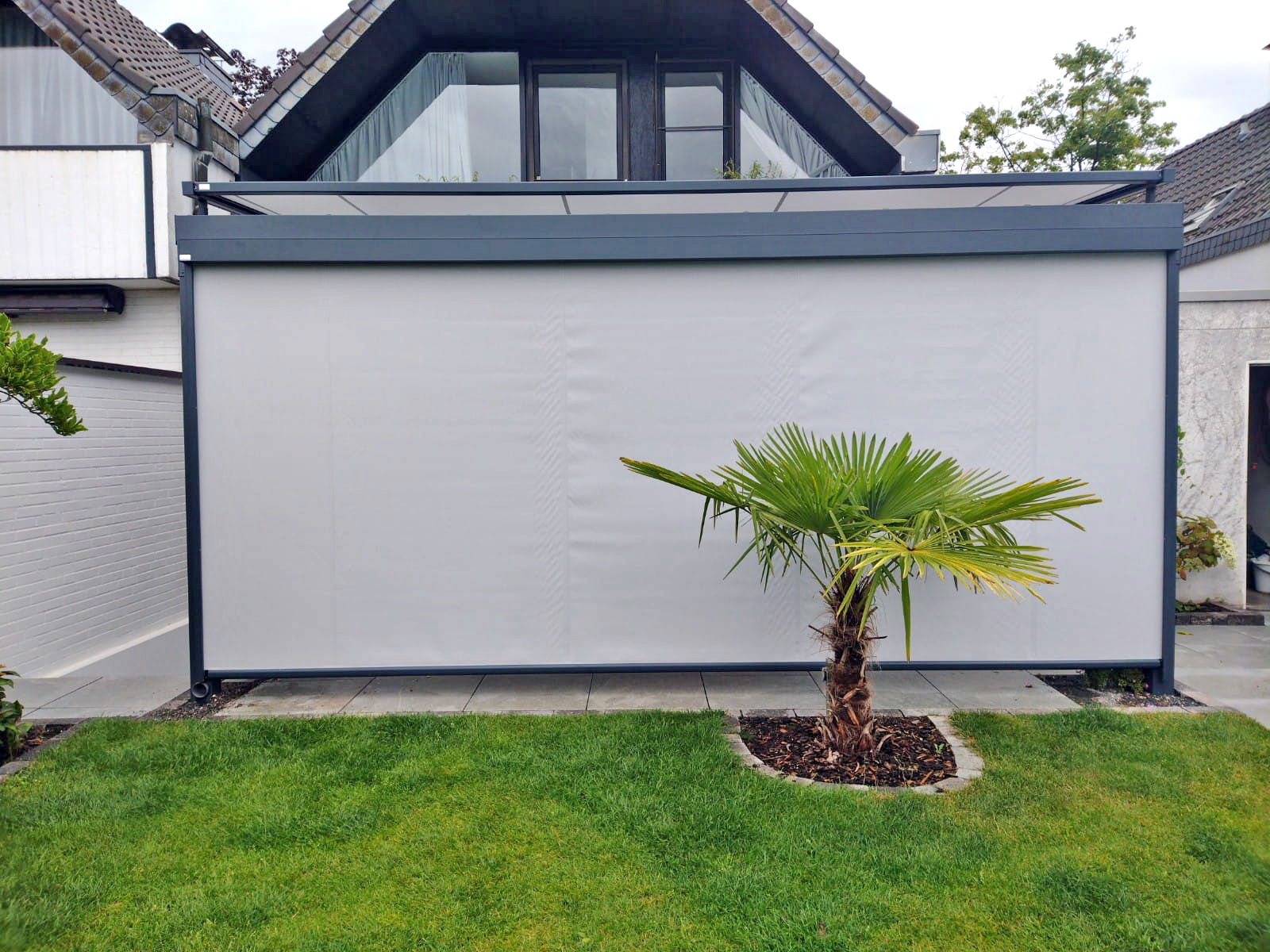 Als Erweiterung gedacht, fängt die Senkrechtmarkise tief stehende Sonnenstrahlen ab und schenkt angenehme Lichtverhältnisse. So sorgt sie auch im heißen Sommer für angenehm temperierte Räume. Praktisch, vielseitig und gleichzeitig elegant im Design. Der aha-Effekt entsteht beim Ausfahren: Bis zu 18 qm Tuchfläche verbergen sich in dem kleinen Markisenkasten – bei einer maximalen Breite von 6.000 mm und einem Höchstausfall von 3.000 mm. Praktisch für die individuelle Terrassengestaltung: Unsere Senkrechtbeschattung ist mit Zipsystem / Schienenführung erhältlich.