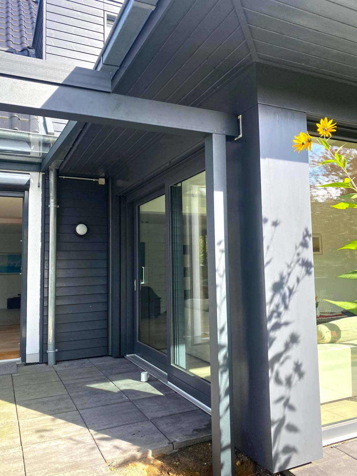 Alumaximal ist eine unserer Hausmarken aus deutscher Fertigung. Für dieses Projekt im niederrheinischen Krefeld wurde an ein Einfamilienhaus das passendes Alu Terrassendach auf zwei Pfosten samt Unterdach Markise vom Kunden gewünscht.