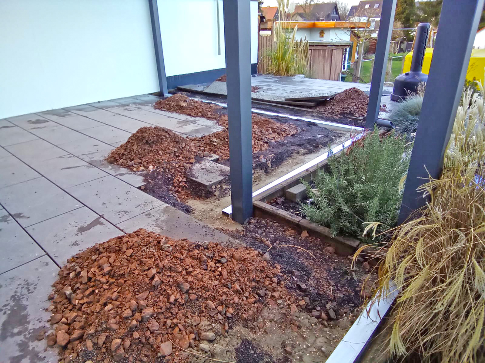 Baumaße des Terrassendachs: Regenrinne UK 2630 mm, Wandprofil OK wurde 20 mm höher angesetzt. Der Terrassenboden wurde bauseits geöffnet, wir von Terrassendach-Händler.de setzen alle Fundamente samt Unterkonstruktion. Die Terrasse hat einen Versatz in der Tiefe (Sonderkonstruktion Rinnenversatz)