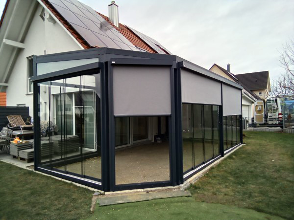 Hochwertige, schienengeführte Varisol Markisen T350 mit Zip System vorbereitet für die Befestigung unter dem Terrassendach.