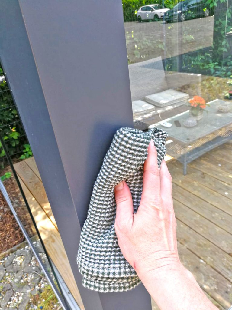 Sie benötigen dazu sauberes Wasser. Am einfachsten geht die Reinigung mit einem Gartenschlauch – der Wasserstrahl (kein Hochdruckreiniger!) erfasst Sand, Erde und Staub, spült sie weg. Jetzt können Sie die Aluminiumteile mit einem weichen Tuch oder Schwamm und ein wenig Seifenwasser / nicht fettende Seife intensiver säubern. Aufgrund der Pulverbeschichtung muss die Seife ph-neutral sein – Scheuermittel bitte nicht nutzen! Zum Abschluss spülen Sie die Überdachung erneut mit Wasser ab. Fertig.