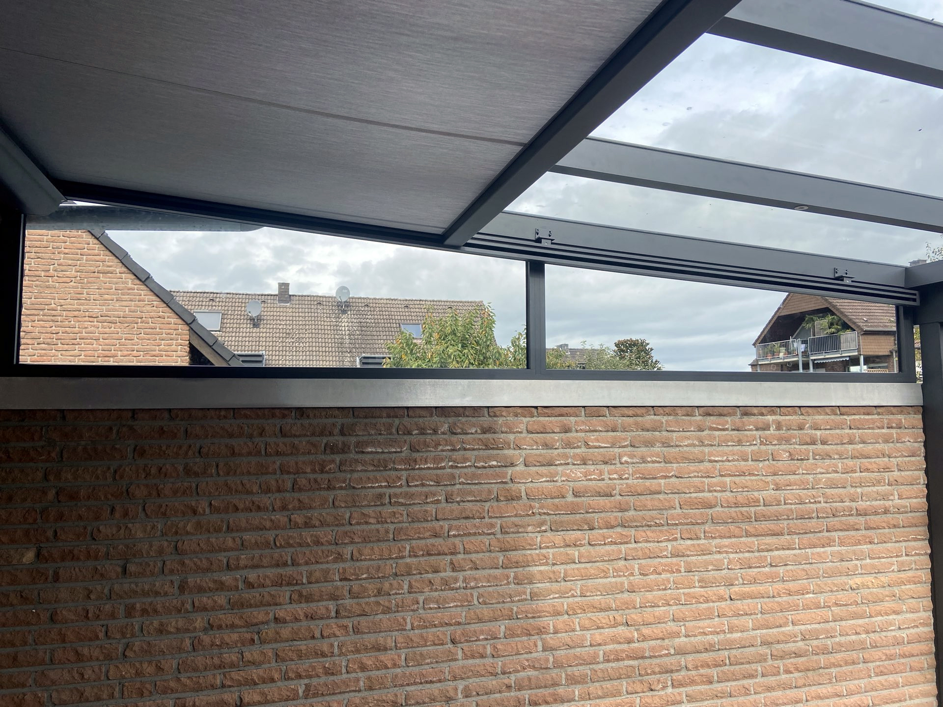 Hochwertige, schienengeführte Varisol Markise T350 mit Zip System vorbereitet für die Befestigung unter dem Terrassendach.
