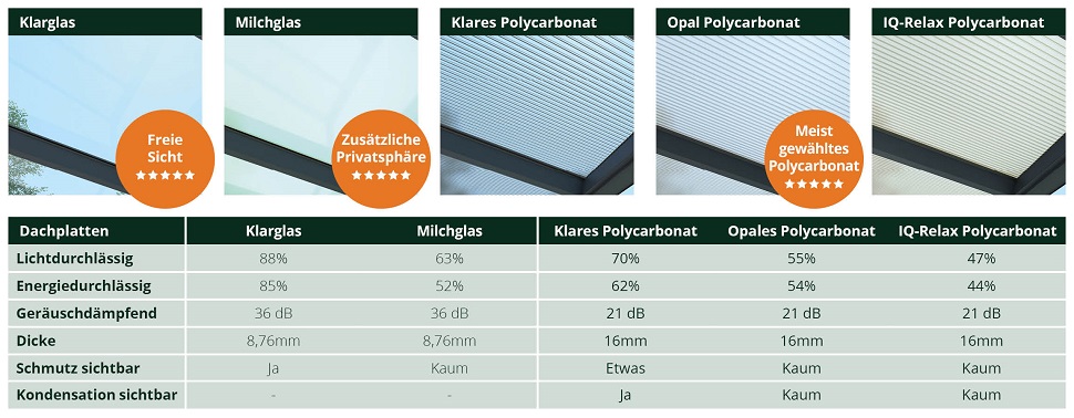 Auch in Sachen Langlebigkeit heißt der Sieger Glas. Es ist langleber als Polycarbonat, weniger kratzempfindlich und bspw. bei Hagel oder Astbruch widerstandsfähiger. Wenn Sie den Reinigungsaufwand Ihres Terrassendaches minimieren möchten, empfehlen wir Ihnen Milchglas oder opales Polycarbonat, da durch deren Untransparenz Schmutz, Moos und Blätter weniger auffallen. Bei Klarglasplatten und klarem Polycarbonat hingegen sehen Sie „jedes verirrte Blättchen“.